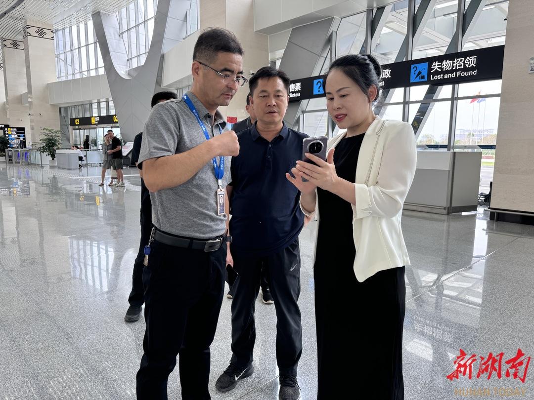 金建平(右一)在懷化芷江機(jī)場調(diào)研旅游市場及服務(wù)。通訊員 楊洋 攝