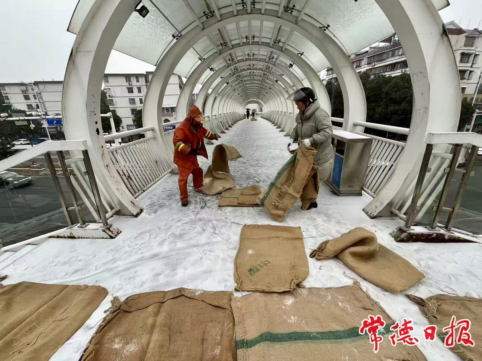 1月20日,破曉時分,寒風凜冽,街頭已是一片忙碌的“橙色”。環衛工人們手持鐵鍬、掃帚,在橋梁、坡道、過街天橋及主要路口奮力清理積雪積冰。在行人必經的天橋階梯上,環衛工人們俯身鋪設防滑麻袋;在易滑路口,則協同撒布融雪劑,防止道路結冰。