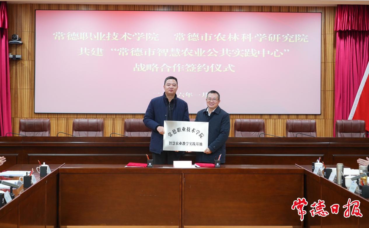 在全體與會人員的見證下,常德職業(yè)技術(shù)學院院長周華與市農(nóng)林科學研究院院長彭煒代表雙方簽署戰(zhàn)略合作協(xié)議,周華向市農(nóng)科院授予“常德職業(yè)技術(shù)學院智慧農(nóng)業(yè)教學實踐基地”牌匾。