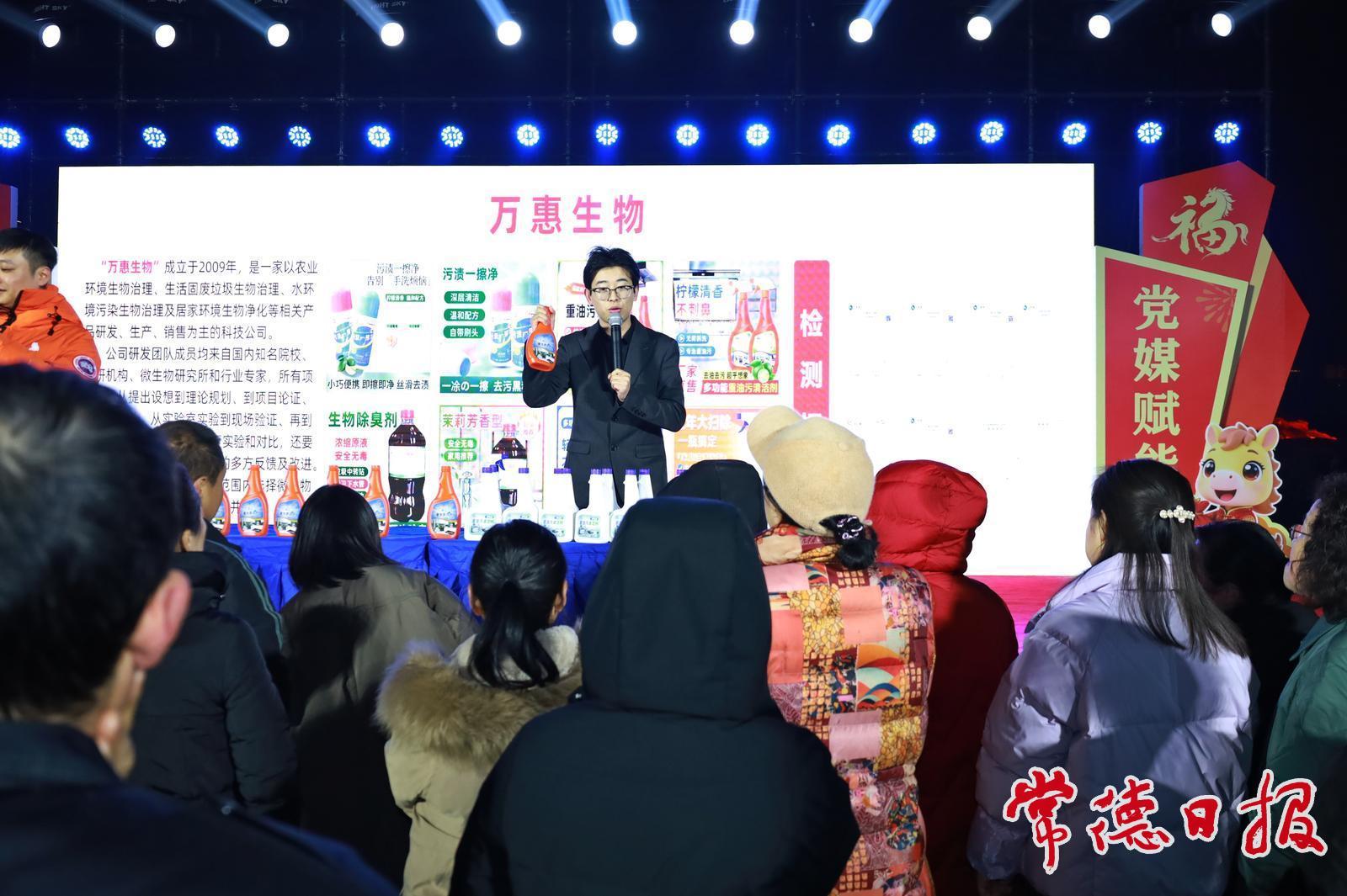 1月26日,冬雨停歇,夜晚的常德河街重歸溫馨。盡管寒意襲人,仍有市民專程來到“德品直銷 春節惠民”2026常德經開區品牌產品惠民展銷活動現場逛展打卡。樂隊登臺獻藝,帶來熱鬧的文藝演出,為逛展增添別樣趣味;主播現場直播帶貨,將萬惠生物兩款清潔好物通過鏡頭推薦給更多市民;參展商還貼心地備好贈品,為前來觀看直播的市民送上驚喜。寒天暖市,德品惠民,誠意濃濃。常德日報記者 鄭彥