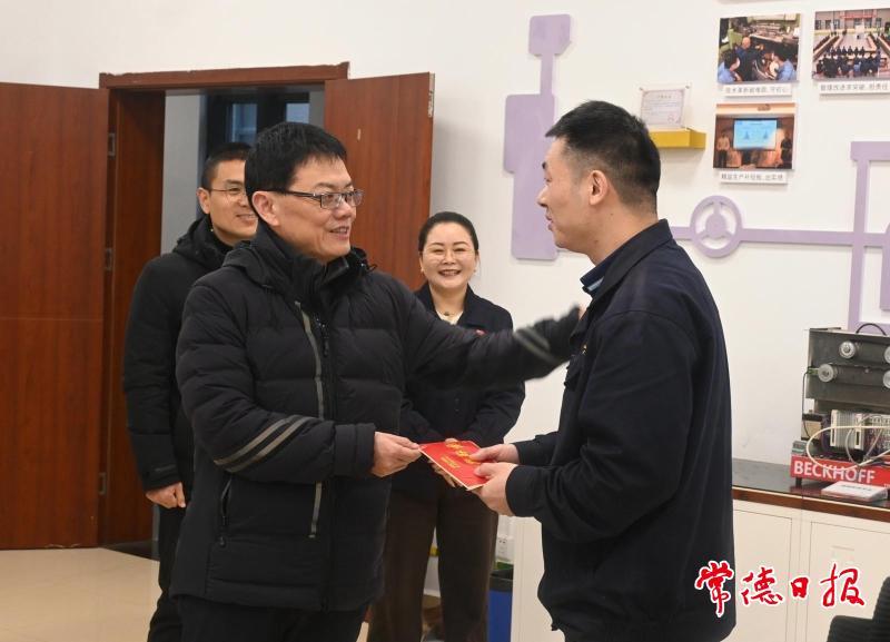常德日報記者 粟鈺 丁時慧 文/圖 1月30日,市人大常委會黨組副書記、副主任、市總工會主席李育智來到湖南中煙常德卷煙廠,走訪慰問湖南省勞動模范周章明,參觀其所在的勞模(工匠)創新工作室,并致以新春祝福。