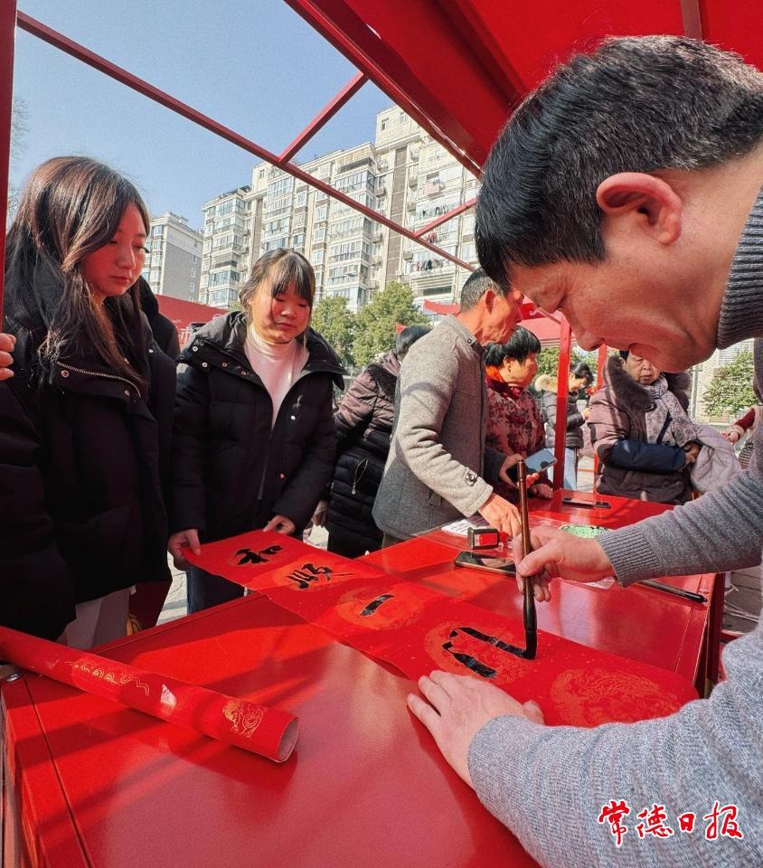 作為當日的重頭戲,由常德市金祥龍貿易有限公司在春秋廣場組織的“墨香迎春”常德書法名家現場贈福活動備受市民歡迎。書法名家齊聚現場,揮毫潑墨書寫春聯與福字,筆鋒流轉間,一副副承載著“馬到成功”“闔家安康”美好寓意的春聯躍然紙上,為新春勾勒出濃墨重彩的文化底色,市民手持剛寫好的春聯,臉上洋溢著幸福的笑容。