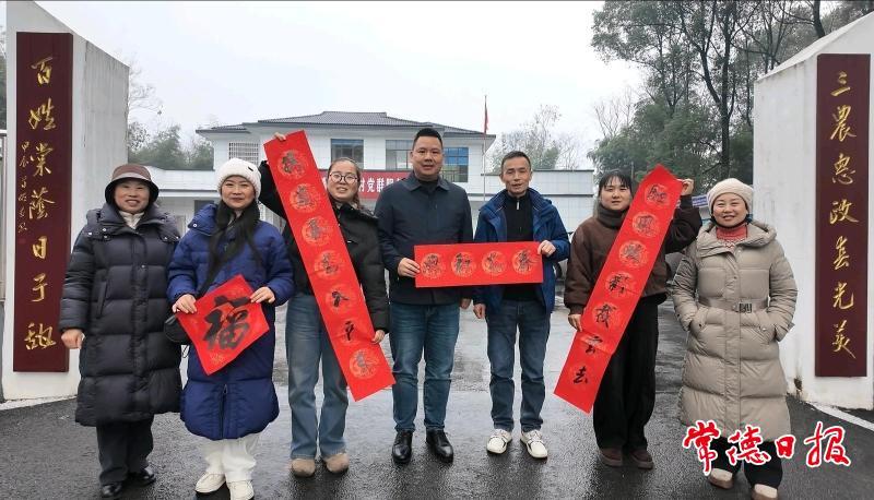 新春臨近,年味漸濃。近日,常德市楹聯家協會工作人員來到鼎城區謝家鋪鎮港中坪村黨群服務中心,為村里送上寓意吉祥的福字。該村黨支部書記代麗平雙手接過福字,目光落在中心大門前那副木紋底燙金字楹聯上,感慨萬千。