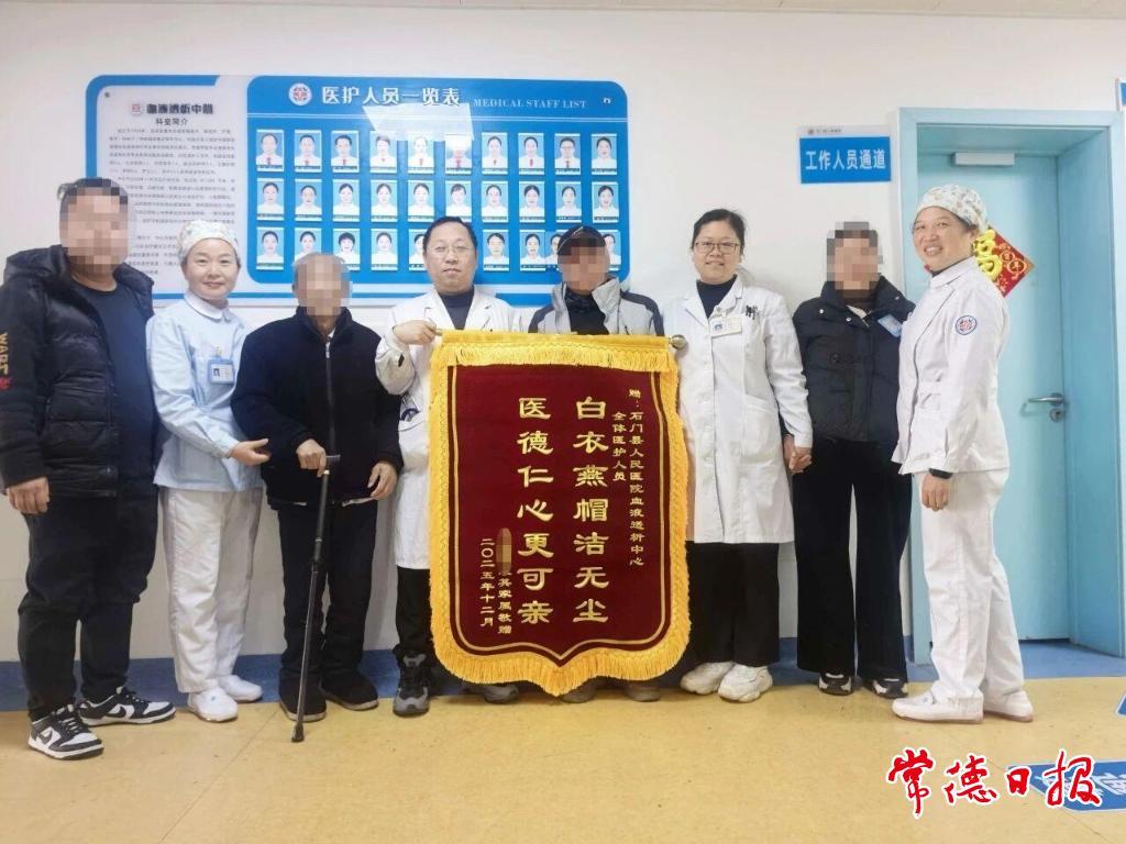 常德日?qǐng)?bào)記者 李白 通訊員 舒涯 文/圖 近日,石門縣人民醫(yī)院血液透析中心收到一面特殊的錦旗。患者家屬覃先生將繡有“白衣燕帽潔無塵,醫(yī)德仁心更可親”字樣的錦旗,鄭重交到副主任伍君和主治醫(yī)師覃悠悠手中,以此感謝7年來醫(yī)護(hù)人員對(duì)81歲老父親的悉心守護(hù)。