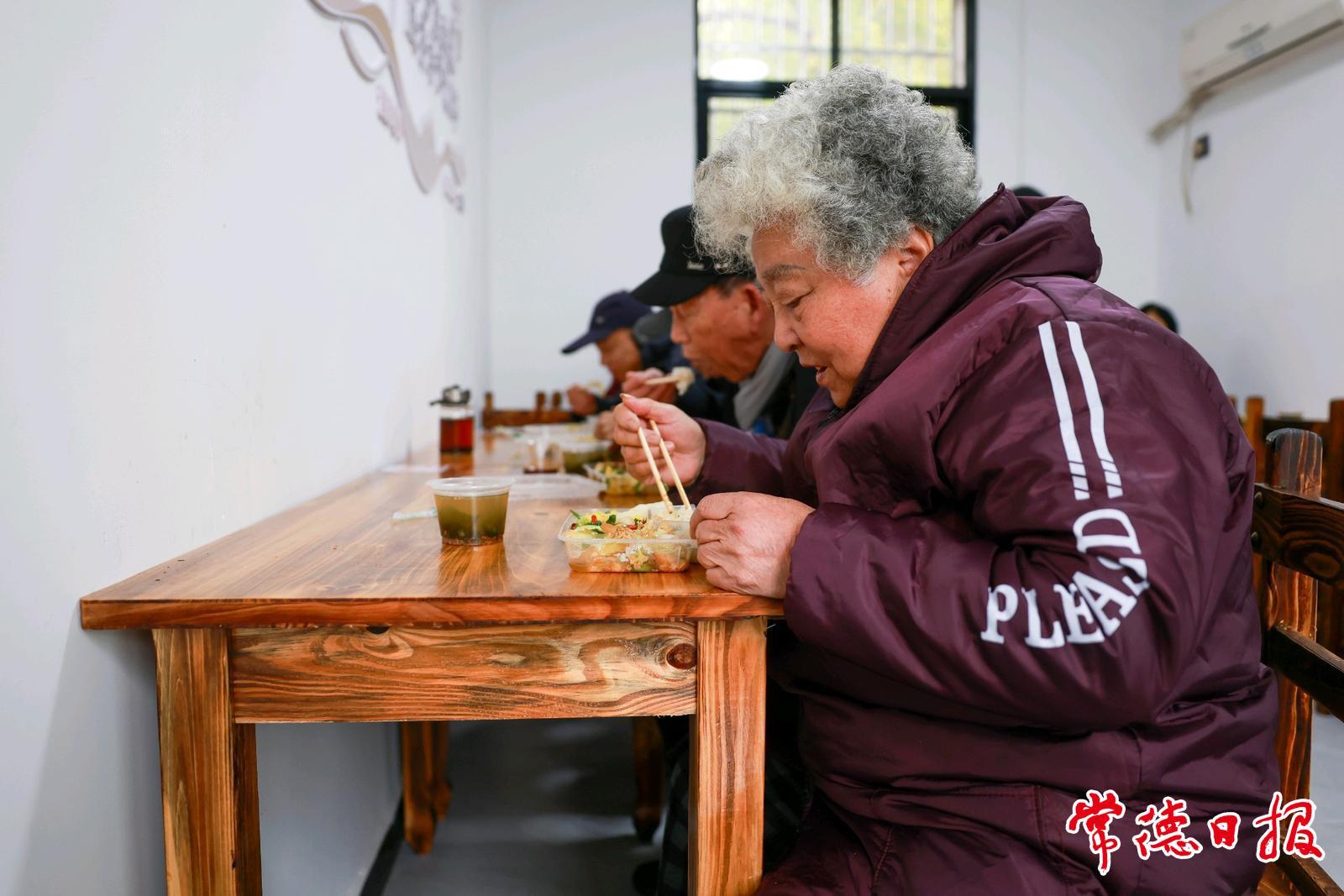 這家日間照料中心前身是縣人民醫院的閑置結算中心。煥然一新的玻璃外墻,門頭掛著新牌子,樓里改出了標準化配餐室、活動室和休息區等空間。配餐室門口,工作人員送來了一盒盒熱餐。活動室里,筷子碰著餐盒叮當響,老人們邊吃邊聊,不知誰說了句什么,哄笑聲炸開。