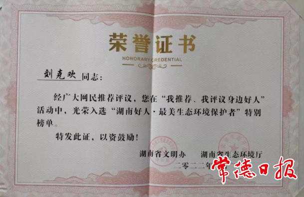 ????近年來,劉克歡還獲得了全國“百名最美生態環境志愿者”、全省第一批“綠色衛士”、全省優秀志愿者等榮譽。