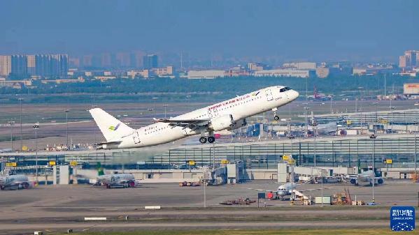 ????2022年5月14日6時(shí)52分,編號(hào)為B-001J的C919大飛機(jī)從上海浦東機(jī)場(chǎng)第4跑道起飛,于9時(shí)54分安全降落,標(biāo)志著中國(guó)商飛公司即將交付首家用戶的首架C919大飛機(jī)首次飛行試驗(yàn)圓滿完成。新華社發(fā)