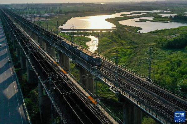 ????重載列車行駛在大秦鐵路上(2022年7月16日攝,無(wú)人機(jī)照片)。為做好迎峰度夏能源保供工作,中國(guó)鐵路太原局集團(tuán)有限公司在確保運(yùn)輸安全的前提下全力提升煤炭運(yùn)量。新華社記者 曹陽(yáng) 攝