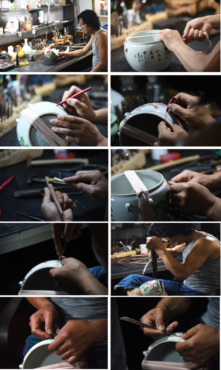 李氏鋦瓷從清末民初之后分為兩大類,即:常活,就叫粗活,純?yōu)槊耖g生活用品為主的鋦瓷修復粗活。而另一類則是經(jīng)過藝術加工專為藝術收藏的鋦瓷細活,即:行活,也叫秀活。