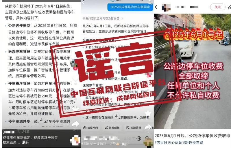 真相:近日,個別網民在網絡平臺發布信息稱,“成都市停車新規定,從2025年6月1日起,所有公路邊停車位將不再收取停車費,市民可以免費使用”,引發關注。對此,微信公眾號“成都停車App”發布聲明稱,網傳“成都市所有公路邊車位將不再收取停車費用”“6月1日起成都路邊停車位0元”系不實信息,暫未收到上級單位停止收費的通知。成都市中心城區臨時占道停車場是按照《四川省〈中華人民共和國道路交通安全法〉實施辦法》的相關規定,由成都市公安交管部門統一規劃、設置。收費標準按照成都市發改委《關于調整城區機動車臨時占道停放差別化收費標準的通知》(成發改收費〔2011〕1334號)文件執行。(來源:“成都網絡辟謠”微信公眾號)