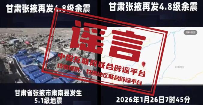 詳情:近期,網上流傳“2026年1月26日7時45分甘肅省張掖市肅南縣發生5.1級地震”“甘肅張掖再發4.8級余震”等消息,引發關注。經核實,網傳視頻中所顯示震中地理位置位于新疆喀什、和田地區,所呈現的季節特征也與甘肅省張掖市本季節景色不符。截至當前,中國地震臺網中心未查詢到張掖市轄區當日發生地震的相關記錄,張掖市地震局、張掖地震監測中心站未監測到任何可能引發破壞性地震的前兆異常信號,也未發布任何地震預警、預報信息。網傳內容不實。(來源:“甘肅網絡舉報”微信公眾號、張掖市融媒體中心、張掖市地震局)
